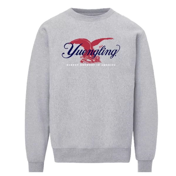 Classic comfort meets iconic American heritage. This heather gray crewneck features the bold Yuengling script layered over a striking red eagle graphic, finished with “Oldest Brewery in America” beneath. Made with a soft, mid-weight fleece, this crewneck is built for crisp mornings, cool nights, and everything in between. The timeless red, white, and blue design makes it an easy go-to for game days, brewery visits, or simply repping America’s Oldest Brewery wherever you are.