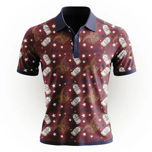 Bring heritage style to the forefront with the Yuengling Lager Repeat Polo: a bold, all-over print that celebrates nearly two centuries of American brewing tradition. Featuring iconic Yuengling America’s 250th Lager cans, the classic eagle emblem, and a patriotic star pattern, this polo blends timeless brand elements with a modern, standout design.