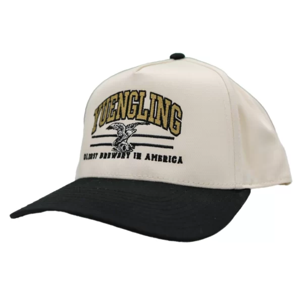 Top off your look with classic Yuengling style. This cream and black hat features bold embroidered Yuengling lettering and the iconic eagle logo, celebrating Oldest Brewery in America. The structured crown and adjustable snapback ensure a comfortable fit for everyday wear. Perfect for brewery tours, backyard hangs, or showing off your Lager pride.